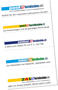 | Nutzen Sie die Kraft von ... BEISPIELE www.achensee.hotelissimo.at / achenseel@hotelissimo.at, www.packages.hotelissimo.ch / packages@hotelissimo.ch, www.wellness.hotelissimo.de / wellness@hotelissimo.de, www.wein.hotelissimo.com / wein@hotelissimo.com, www.angebote.hotelissimo.net / angebote@hotelissimo.net, www.gardasee.hotelissimo.it / gardasee@hotelissimo.it, www.edv.hotelissimo.de / edv@hotelissimo.de, ... weiter > |